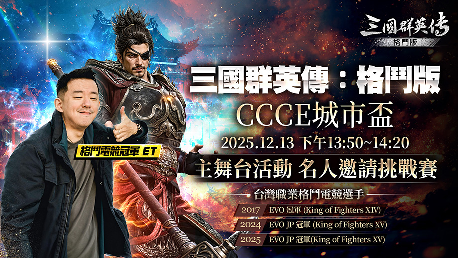 除了展覽與 DEMO 釋出之外,《三國群英傳:格鬥版》也將於 12 月 13 日 13:50–14:20 在城市盃 CCCE 舞台登場。官方特別邀請 EVO 冠軍、格鬥電競名人 ET 大表哥 現身與玩家進行表演賽互動。現場觀眾將有機會登台與選手對決,親自體驗遊戲俐落的操作深度與熱血對戰感。