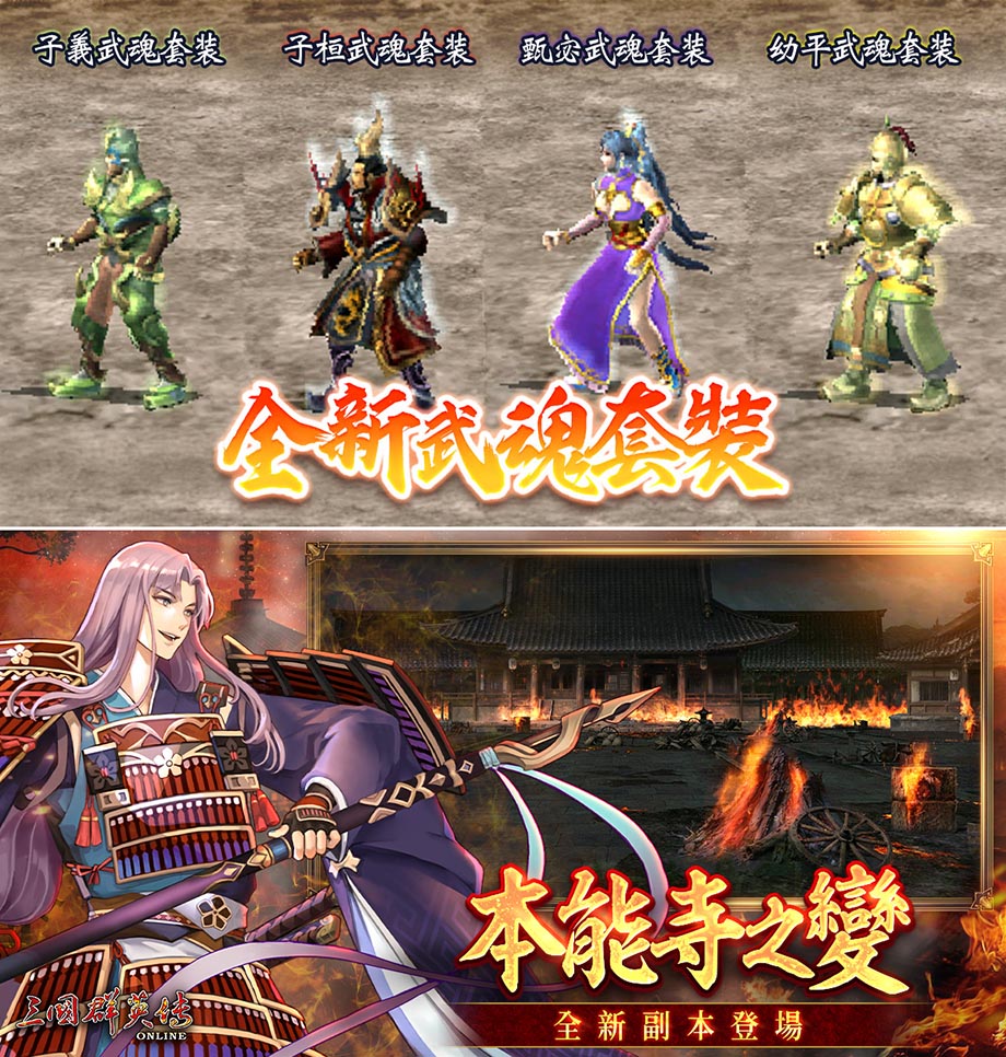 周泰、太史慈、曹丕、甄宓全新武魂套裝正式開放;全新副本「本能寺之變」同步登場,玩家只需於宮殿中與屏風對話即可進入,並有機會掉落全職業裝備與武器。