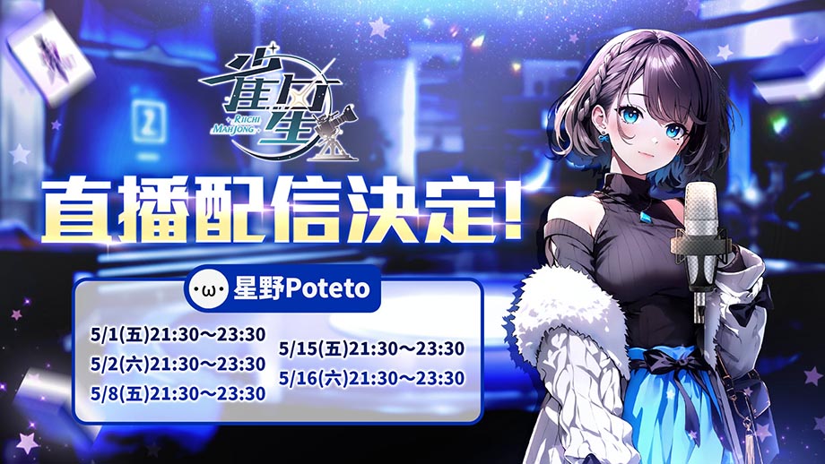 為紀念本次聯動,官方特別攜手日麻 YouTuber「星野Poteto」合作推出遊戲直播配信!無論是剛入坑的新手雀士,還是經驗豐富的老手玩家,都歡迎鎖定本次直播,透過實況深入體驗《雀星》的魅力!